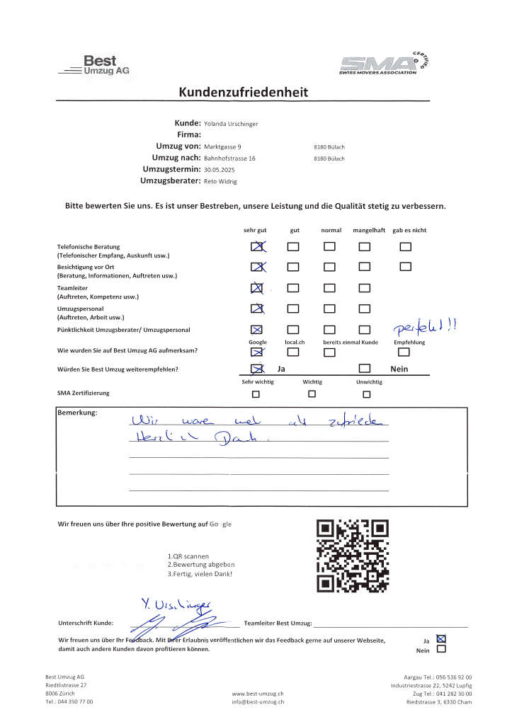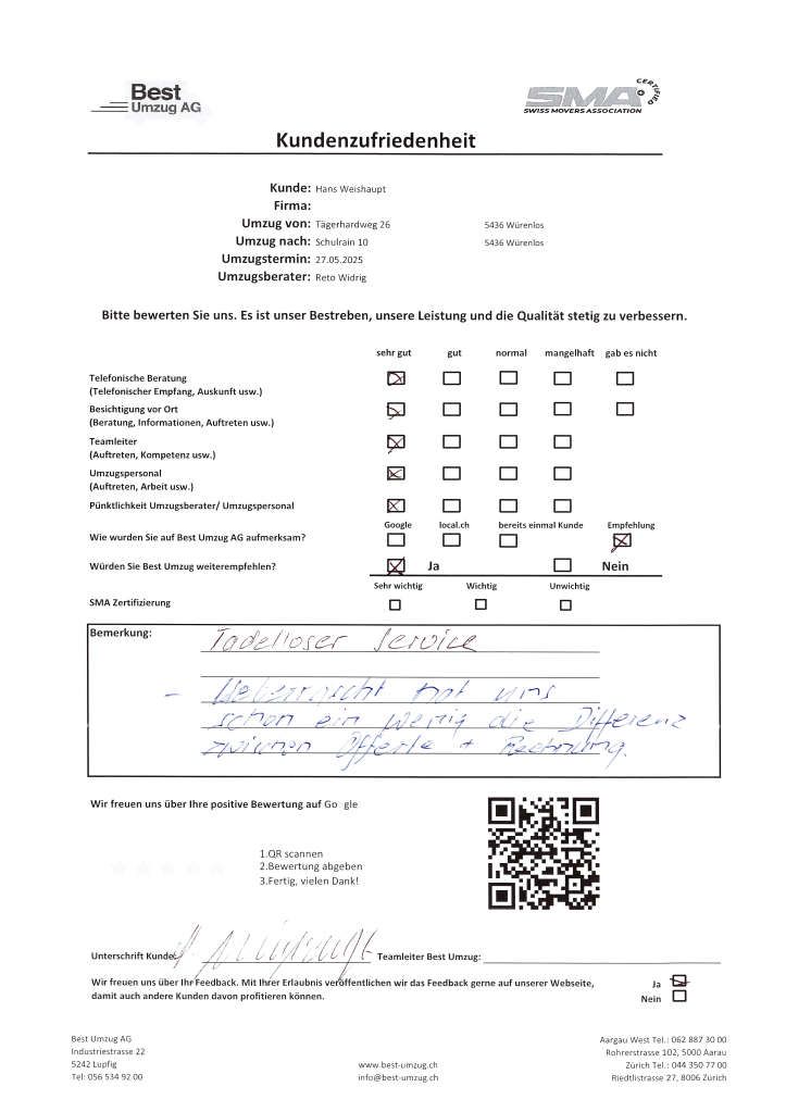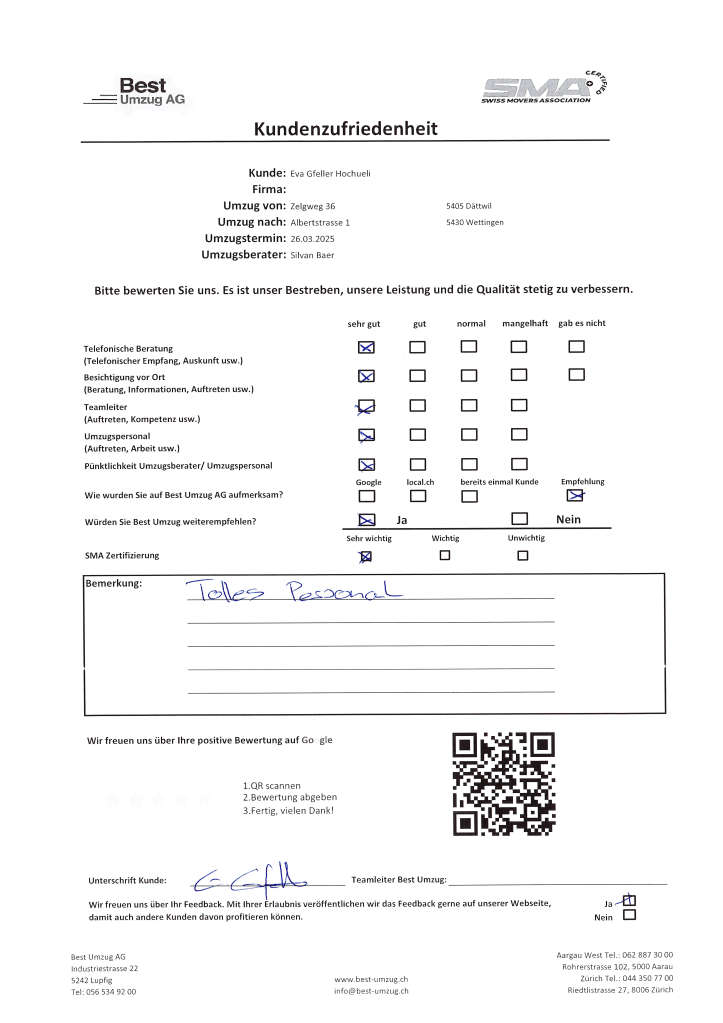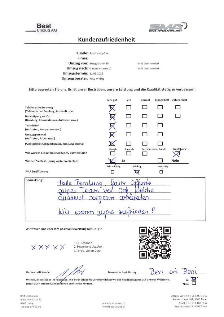 Die Zufriedenheit des Kunden mit unserem Umzugsservice steht stets an erster Stelle. Aus diesem Grund können Sie sich hier selbst ein Bild von der Bewertung des Umzugs seitens unserer Kunden machen. Um unsere Umzugsfirma kontinuierlich zu verbessern und auf Anregungen reagieren zu können, führen wir regelmässige Befragungen zur Kundenzufriedenheit durch. Nicht nur die Arbeit des Umzugspersonals, sondern auch die telefonische Beratung, die Besichtigung vor Ort, das Auftreten des Teamleiters und die Pünktlichkeit sind wir für uns wichtig.