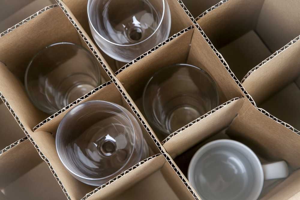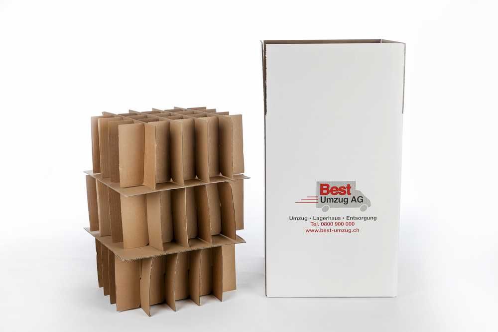Drei übereinander liegende Lagen mit Waben-Fächern, sowie Kartonböden für zwischen den einzelnen Lagen.